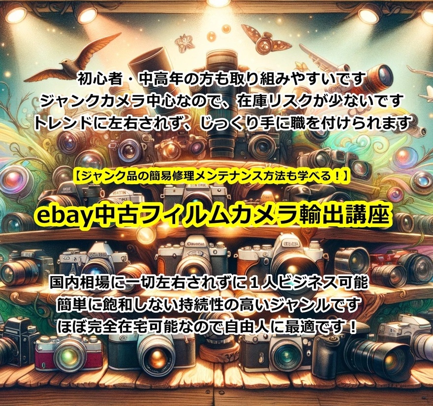 はじめまして講座を申し込みさせて頂きました、●●と申します。 まずは簡単な自己紹介をさせて頂きます。今年51才になります。 副業経験はかなり(10年くらい?)ありいわゆるノウハウコレクター (^_^;) 実は国内カメラ転売(デジタル)の経験(ヤフオク、アマゾン、メルカリ等)は過去(2013頃~2018)にありますが、最終的には自己管理ができず、やめてしまいました。今も趣味程度に転売はたまにやっています。 eBay輸出や輸入は興味はありましたが実践した事はありません。またフィルムカメラ、ジャンク修理等にも非常に興味がありました。当時レンズキャップ等の付属品をeBayで購入していたのでアカウントは持っています。古物は先月申請していて許可待ちです。 私のカメラ転売仲間は現役では数名になってしまい、またeBayで本格的に稼いでいる人はいなく、調べてみて、色々な方の中でも伊藤さんの「取り組みやすく、安定、なひとりビジネスがコンセプトです。」という内容に共感し、またカメラ自体もそうですが「商材としてのカメラへの愛着」もあり申し込みさせて頂きました。もちろん簡単、ラクチンだとは思っておりませんが、よろしくお願いします。
